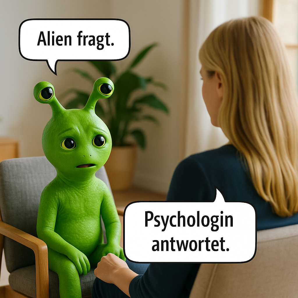 Ein Alien fragt. Eine Psychologin antwortet. Heute geht's um ein Thema, das viele irgendwann einholt: Den Lebenssinn.